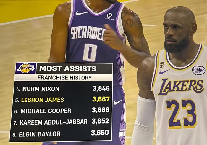 3667次,超越库珀,升至湖人队史助攻榜第五。